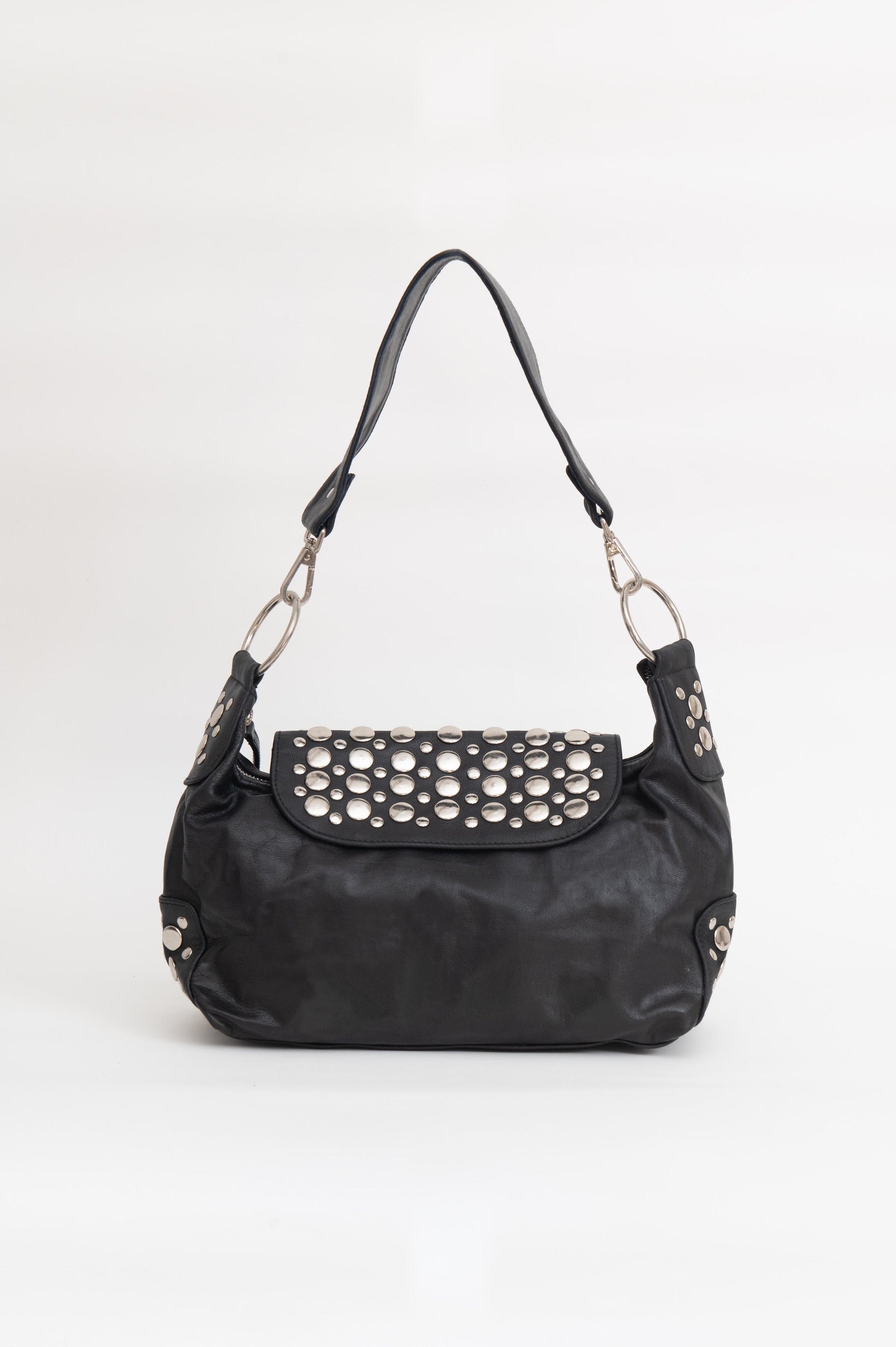 Bolso de piel con tachuelas en la solapa y en otras zonas del bolso, con el que no pasarás desapercibida. Un modelo con carácter, ideal para dar un toque atrevido a tus looks diarios o completar un outfit más especial.
